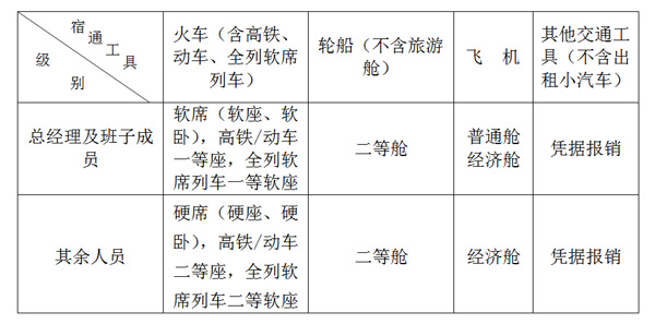 出差人員乘坐交通工具的等級見下表: