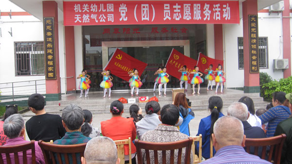 ??? 昭化分公司的團(tuán)員聯(lián)合當(dāng)?shù)貦C(jī)關(guān)幼兒院的青年來(lái)到昭化養(yǎng)老院看望了該院24位殘疾孤寡老人。他們?yōu)槔先藗冎v解了安全用氣常識(shí)并送上毛巾、香皂等生活用品,幼兒院活潑可愛(ài)的小朋友為老人們表演了精彩的舞蹈,養(yǎng)老院洋溢著愉快的節(jié)日氣氛。