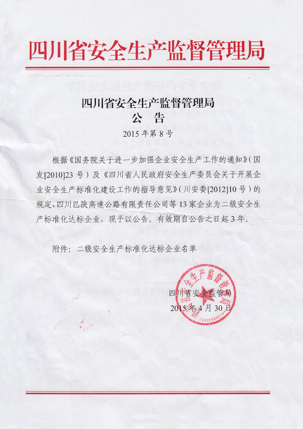 ??? 2015年4月30日廣元市天然氣公司被四川省安全生產監(jiān)督管理局公告(2015年第8號)為二級安全生產標準化達標企業(yè)。
