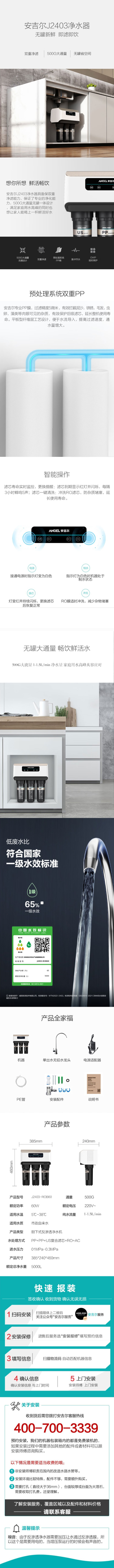 安吉爾凈飲機(Angel)凈水器家用ZMD廚房直飲機反滲透無桶500G大通量凈水器 J2403-ROB60